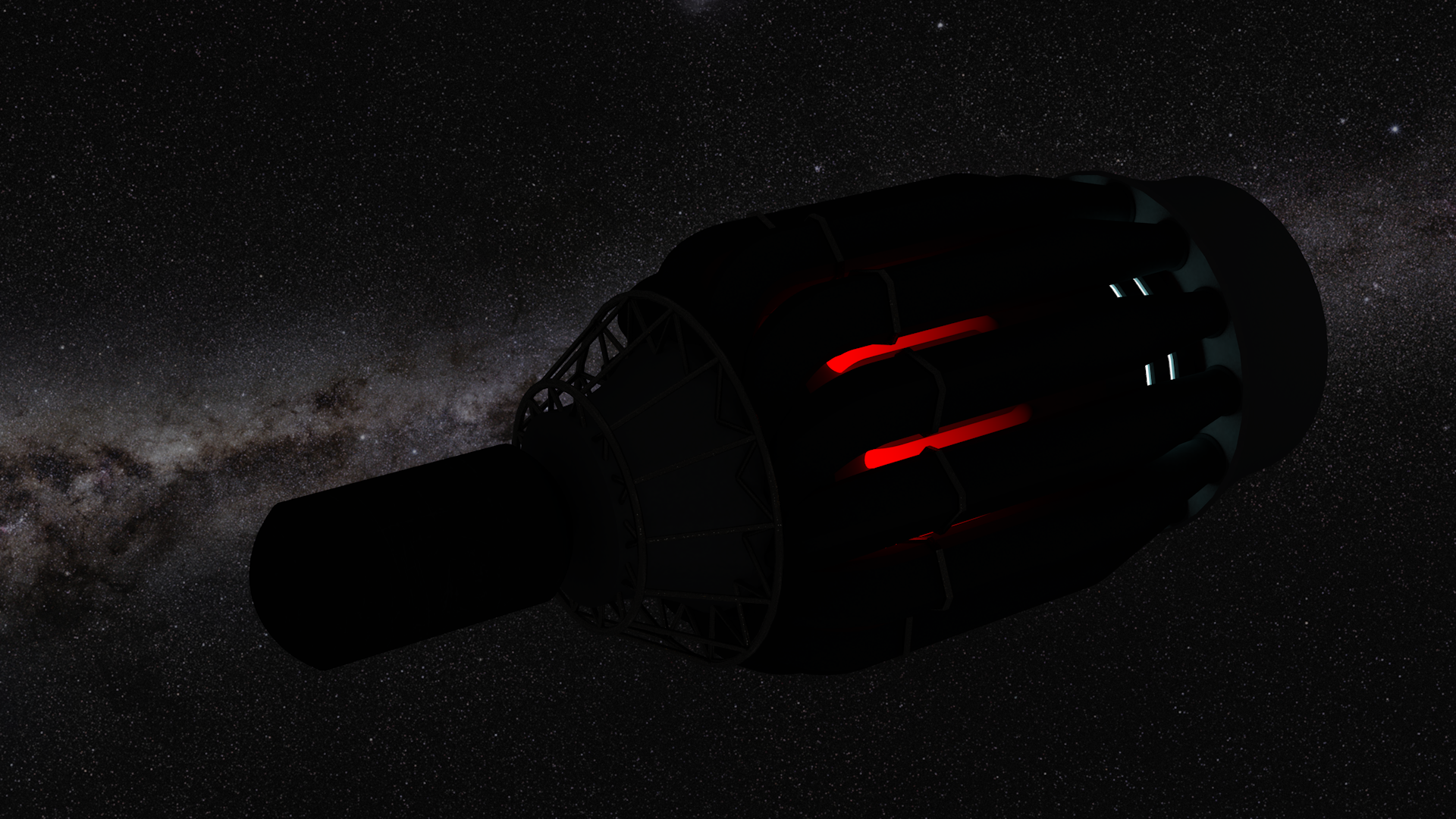 An overview of the ship. Left the antenna module, in the middle the fuel cells, to the right the engines, living module, sunshield and a star.